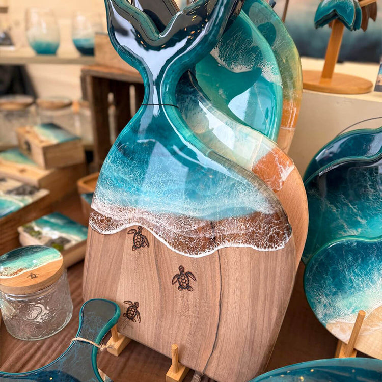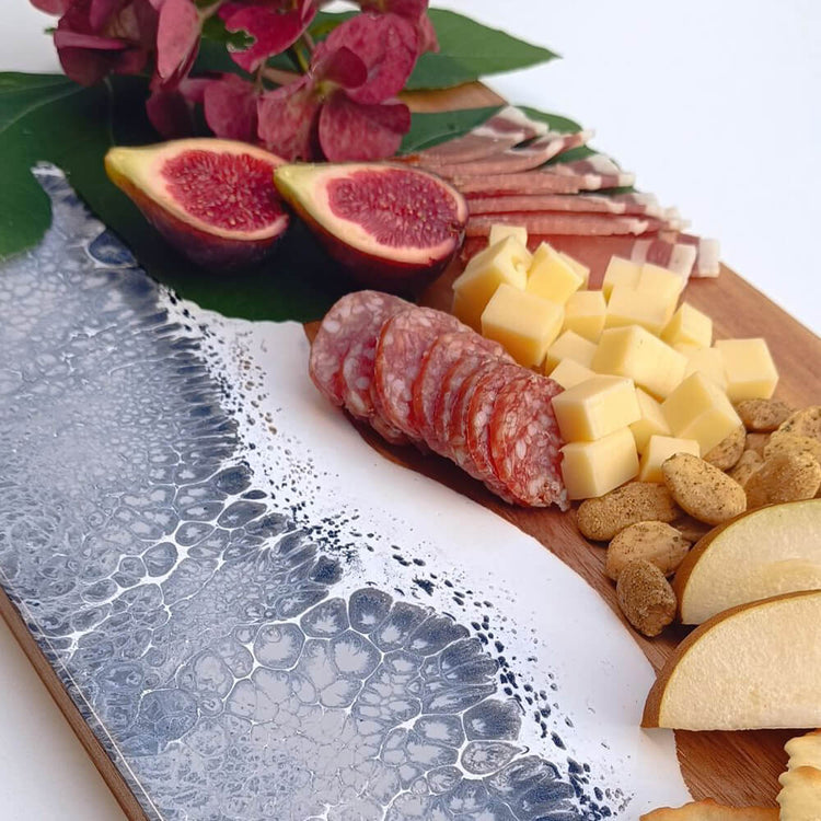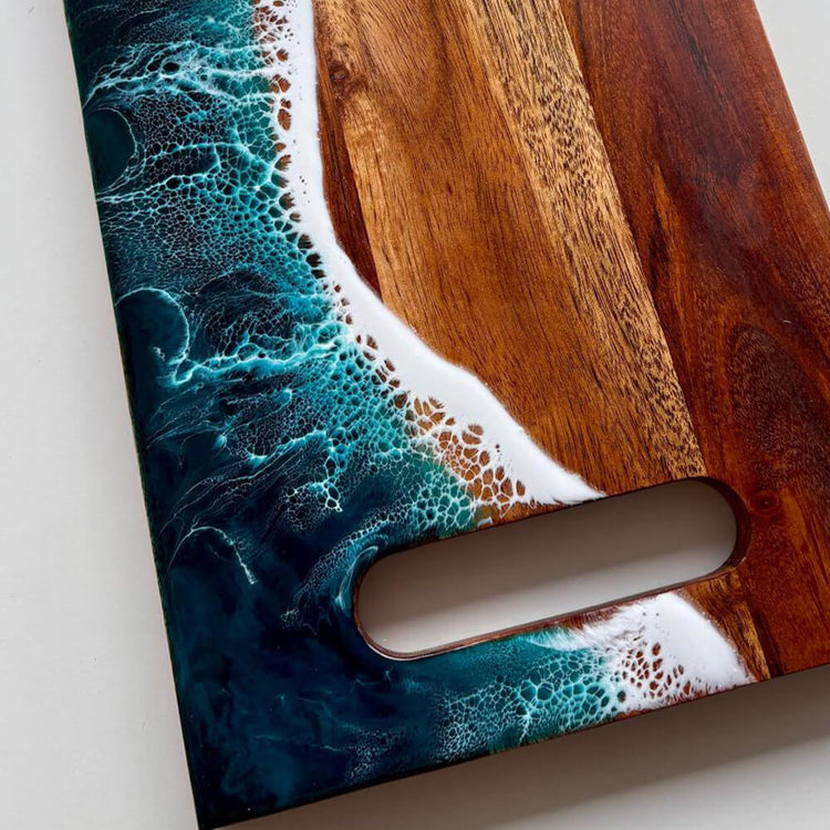 Zusätzlich kann z. B. ein Holz-Servierbrettchen mit Wellentechnik übergossen werden.