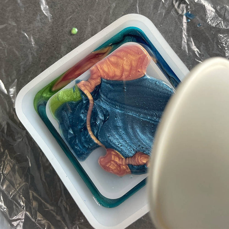 Einfach die gewünschte Farbe der angemischten Harzmasse hinzufügen und losgiessen.