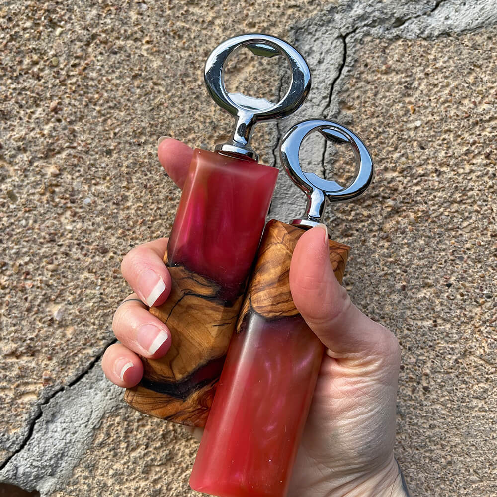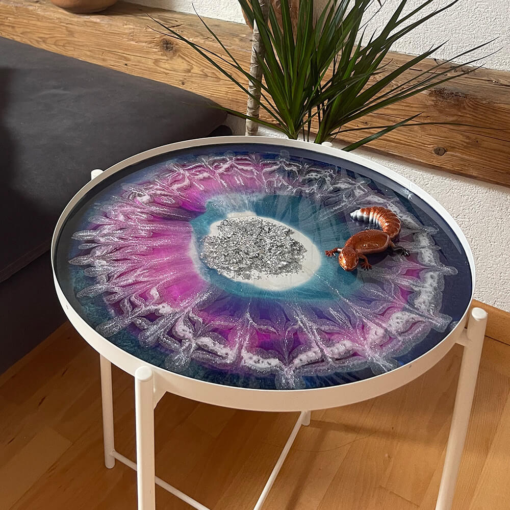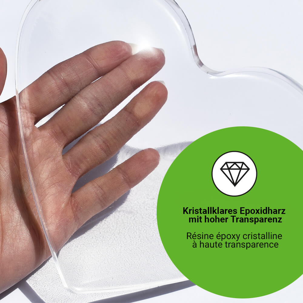 Das Epoxidharz ist von Natur aus klar und transparent, lässt sich aber mit unseren Alkoholtinten oder Effektpigmenten individuell einfärben.