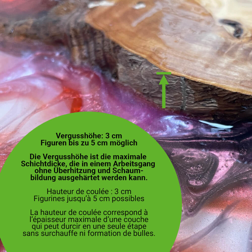 Perfekt für Anfänger: Du kannst damit sowohl in kleine Silikonformen (bis 5 cm) als auch Tischplatten (bis 3 cm) sicher giessen - ohne komplizierte Handhabung.